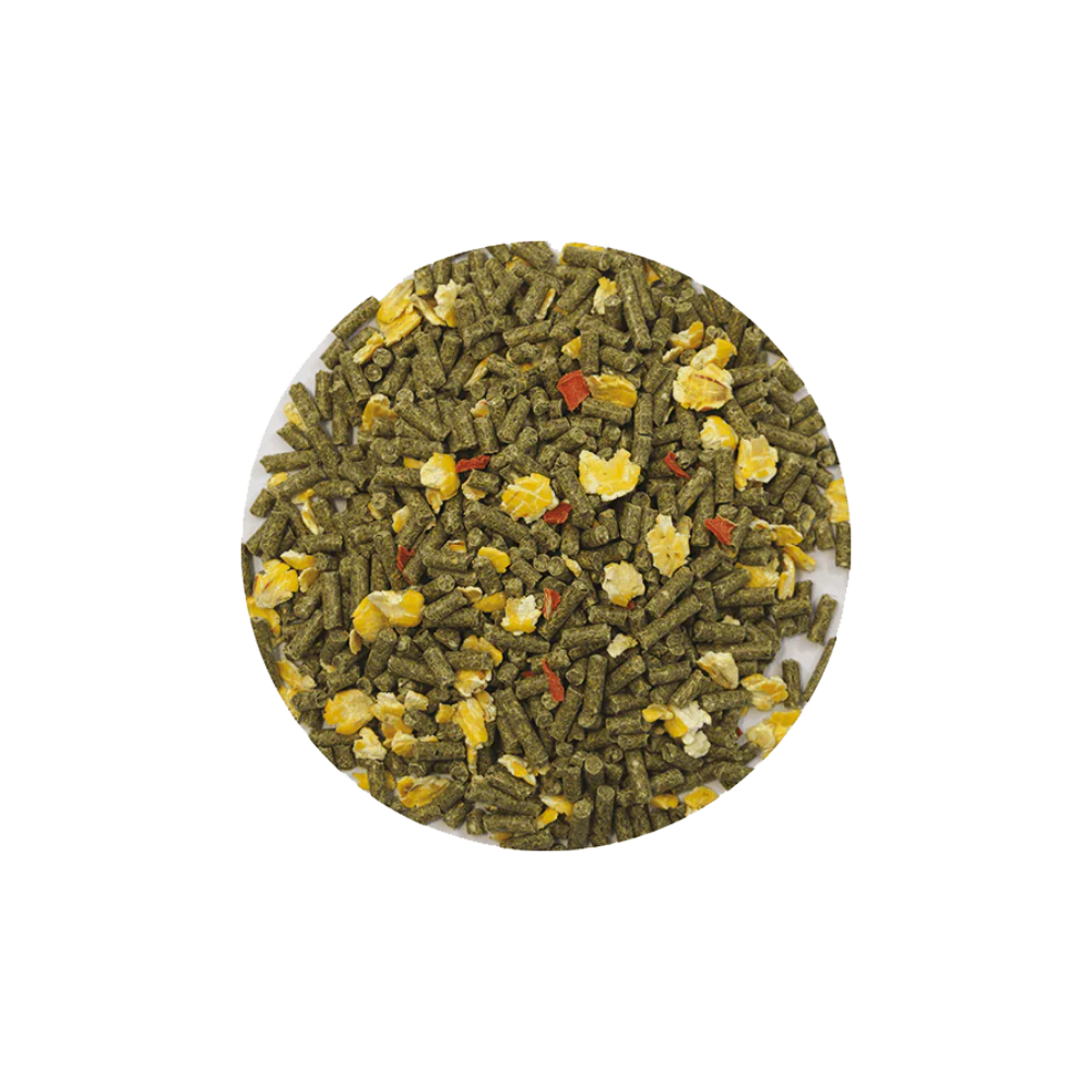 • Verstärkte Energiezufuhr › erhöhter Gehalt an extrudierten Leinsamen, extrudierte Sojabohnen, hochverdauliche Maisflocken.